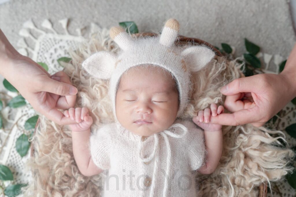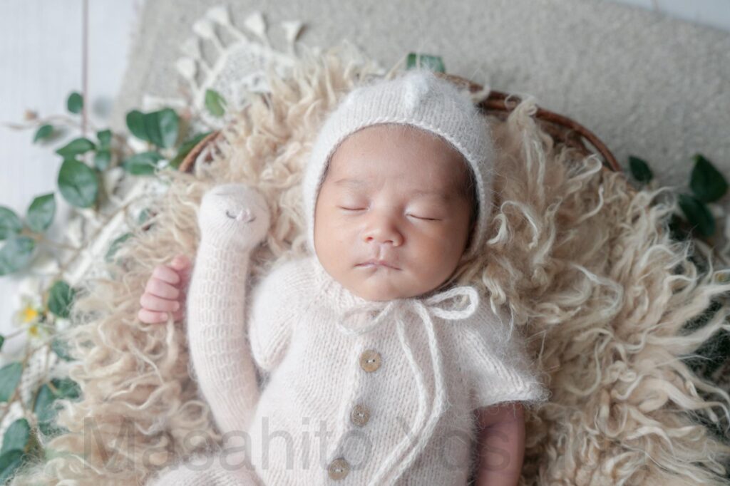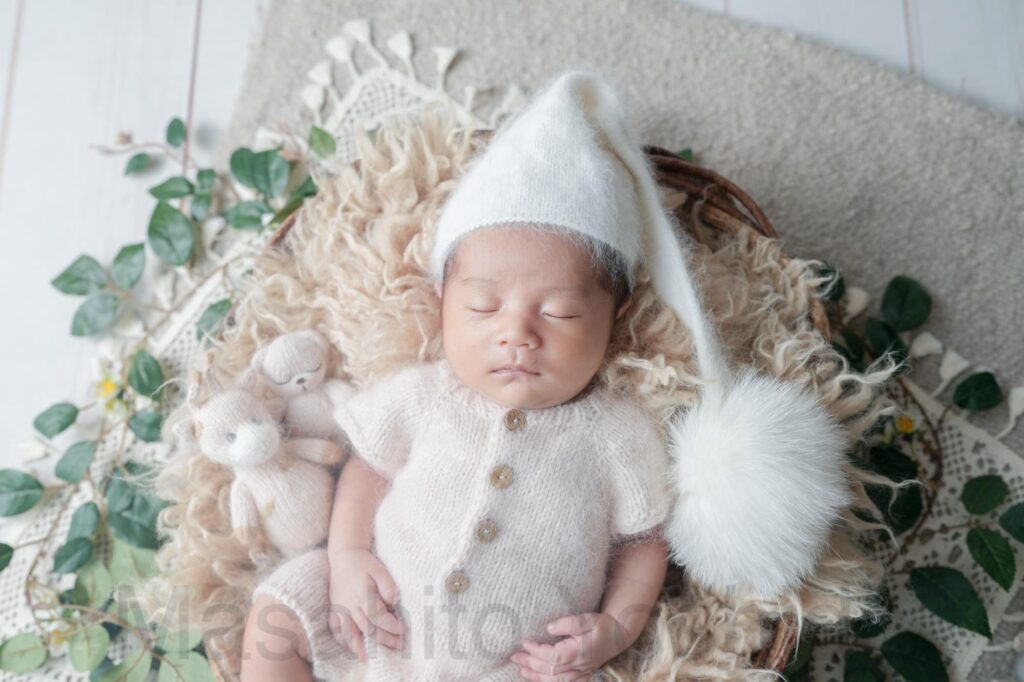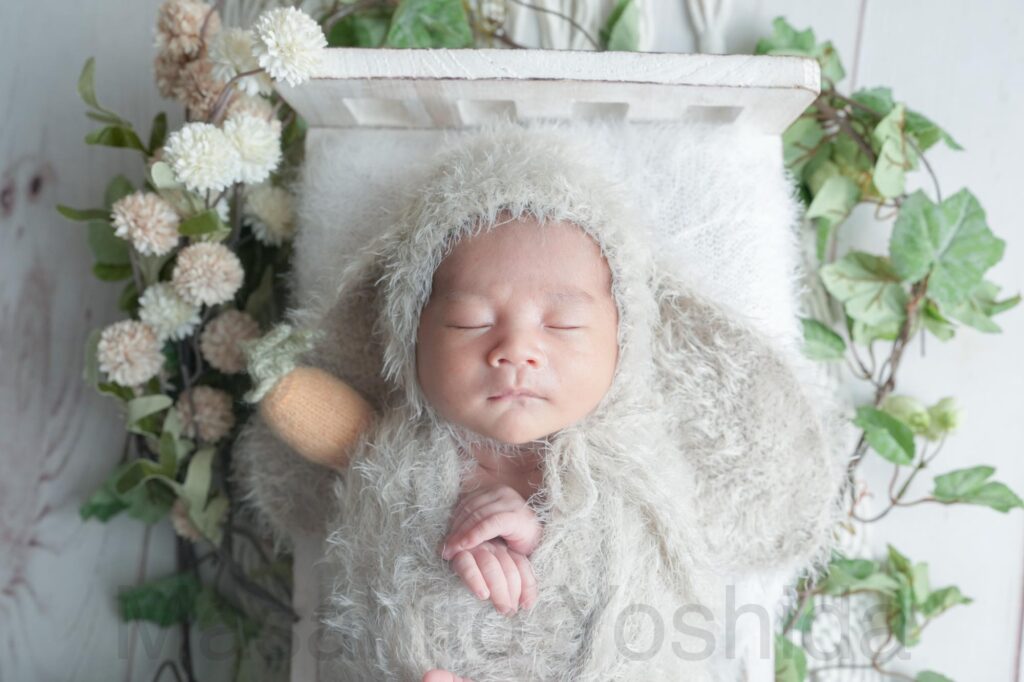 灰色のふわふわのおくるみに包まれ、うさぎの帽子をかぶった赤ちゃんがベッドで眠っているお写真などを撮影しました。