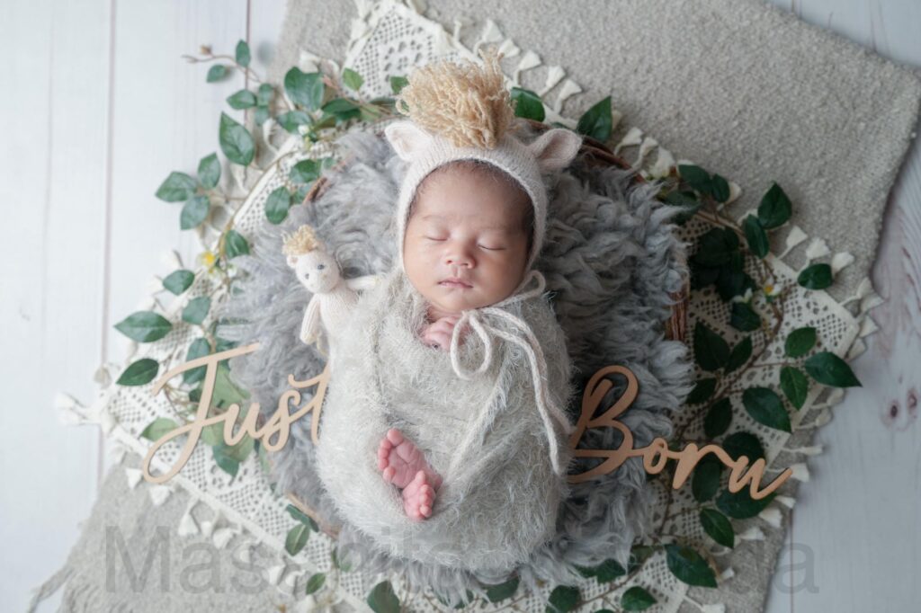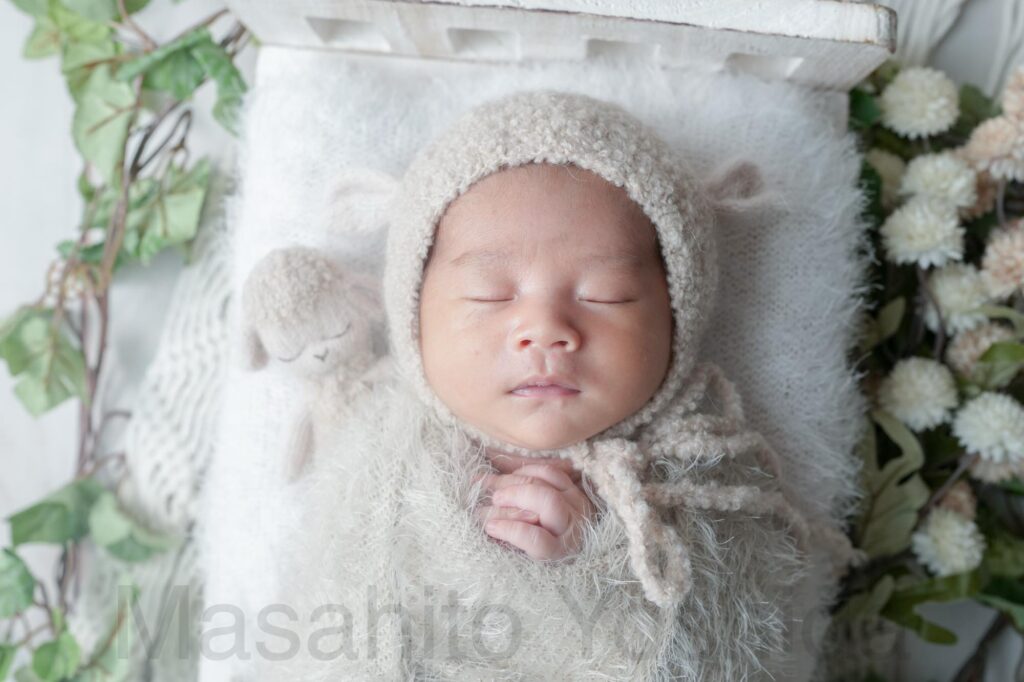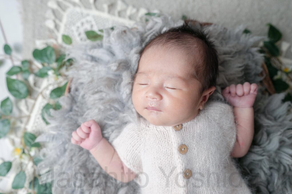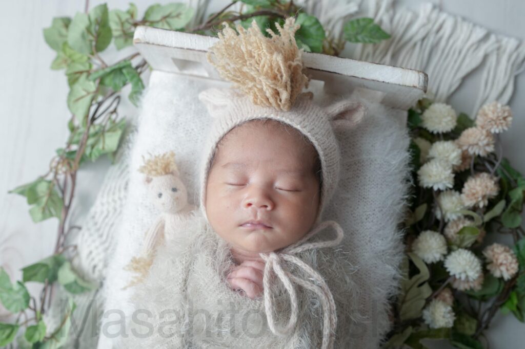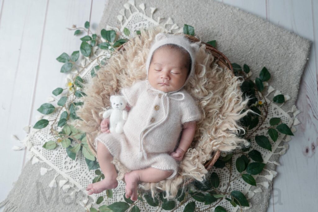 灰色のふわふわのおくるみに包まれ、うさぎの帽子をかぶった赤ちゃんがベッドで眠っているお写真などを撮影しました。