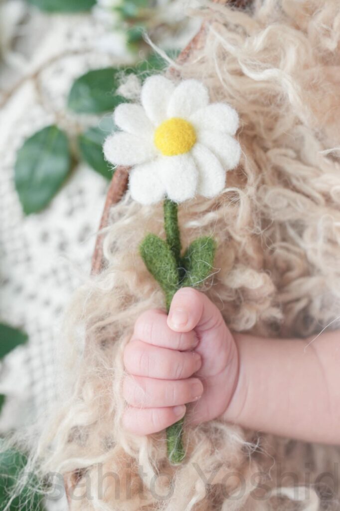 In addition, we photographed a cut where the baby holds a single handmade chamomile flower crafted by an overseas artisan. 🌼